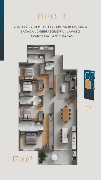 Apartamentos amplos e elegantes de 109 m² a 176 m², todos com living integrado, sacada com churrasqueira e suítes espaçosas, planejados para oferecer conforto, bem-estar e valorização do seu investimento.